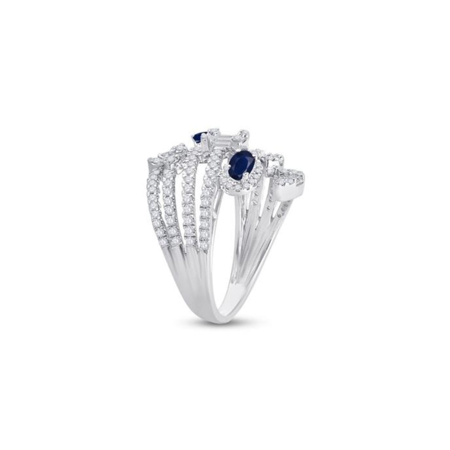 Crafted in 14k white gold, this exquisite Miking Boa Diamond Ring features an alluring combination of 1 3/4 carats of precious gems. A stunning 0.7ctw blue sapphire, complemented by a 0.25ctw baguette diamond in a prong setting, and further enhanced by 0.84ctw round diamonds in colors G-H, elegantly placed in a channel setting, make this piece unique. Code MG152800.